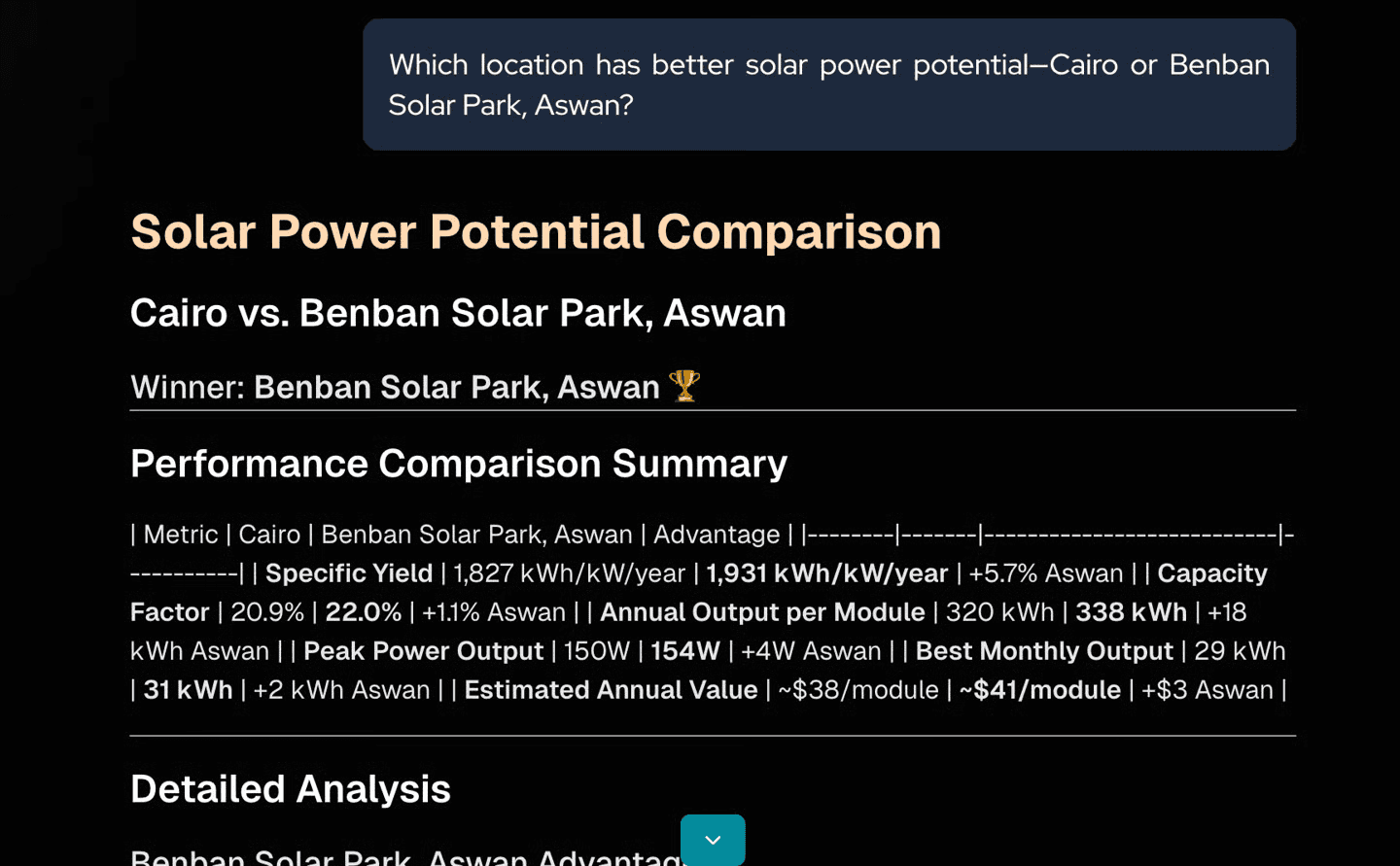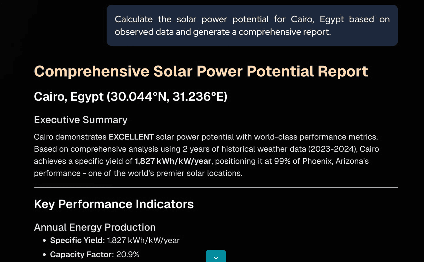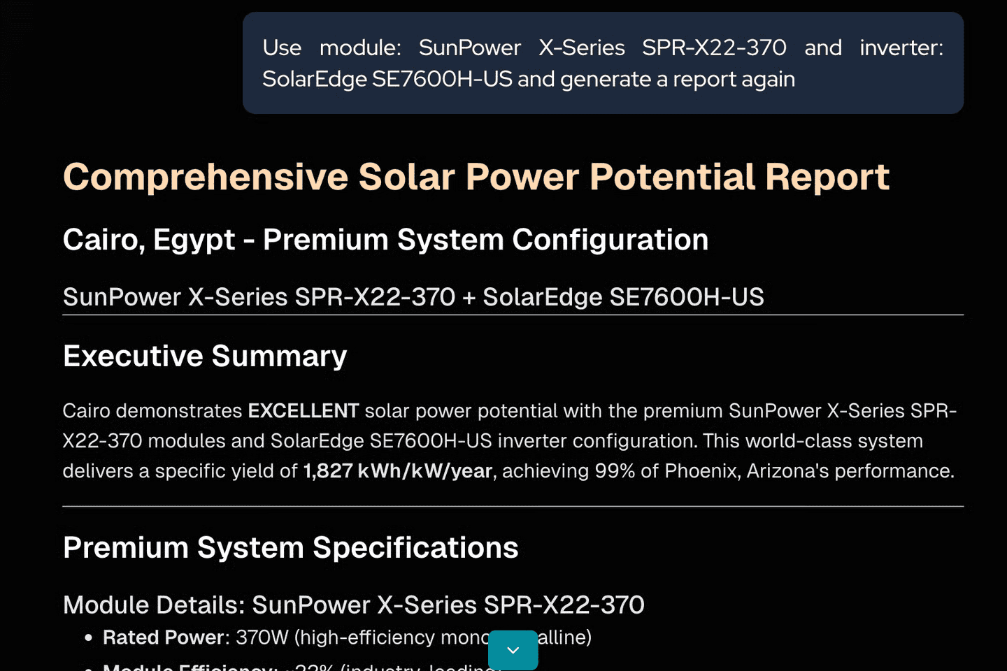 Imagine being able to calculate the solar power potential of any location—simply by describing it in natural language. That’s exactly what Kumo enables. Built for both casual users and professional solar engineers, Kumo performs high-fidelity solar simulations using advanced models that account for solar position, irradiance, temperature, and local meteorological data. By modeling the interaction between sunlight and your chosen PV modules and inverters, Kumo produces accurate energy output estimates, factoring in orientation, tilt, shading, and real-world system losses.